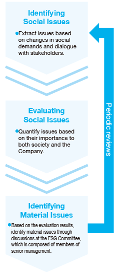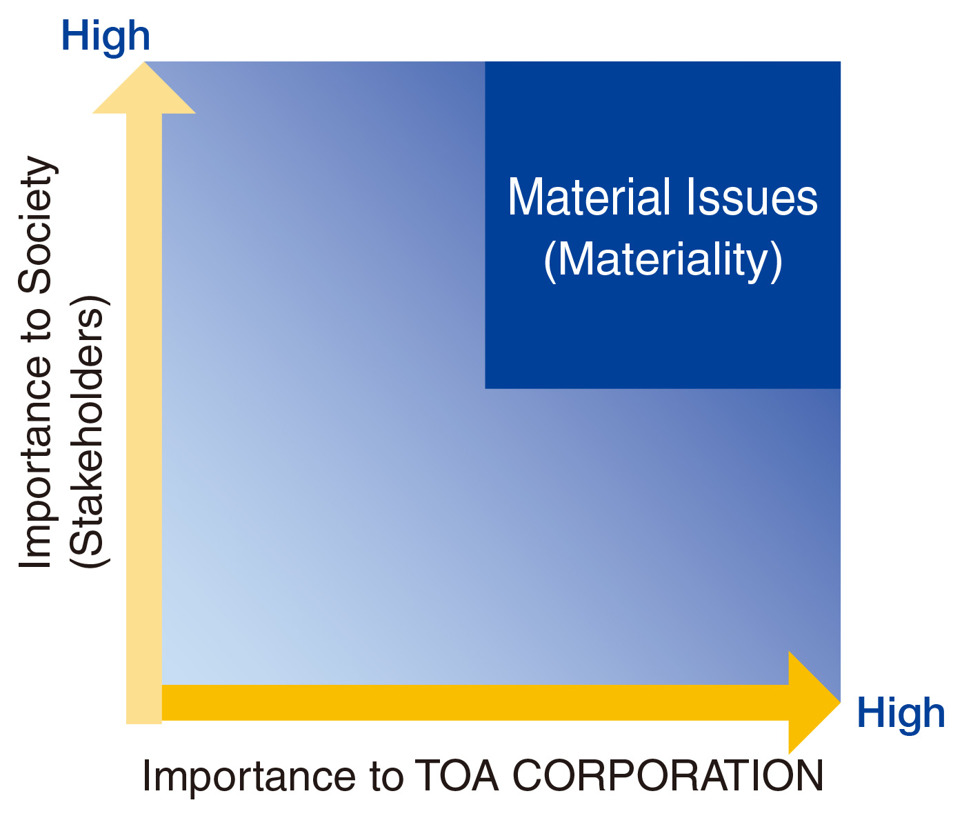 TOA CORPORATION identifies social issues by referencing international standards such as ISO 26000 and the SDGs, surveys by external ESG rating agencies, and communication with stakeholders. Among the issues considered highly important and relevant both to society (stakeholders) and to the Company, we have specified five priority items as material issues (materiality) requiring focused action. In addition, to respond to changes in risks and opportunities stemming f rom shifts in the social environment, we review our material issues once a year.