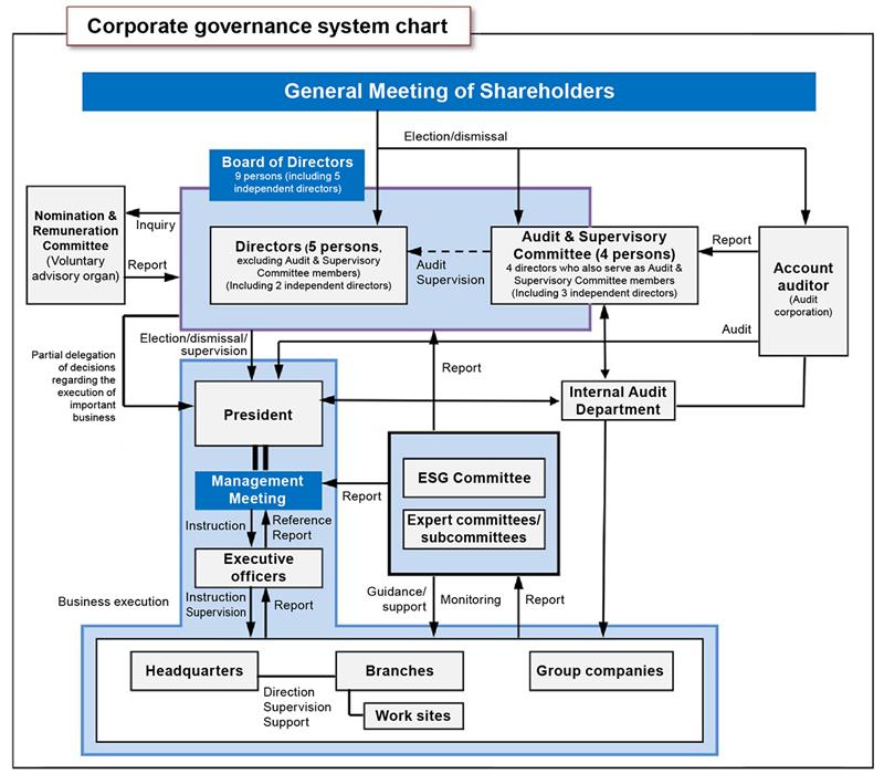 Under the management philosophy of “striving for prosperity through advanced technology and fulfilling social responsibilities through sound management,” the Group has set the long-term vision , which is “Building a prosperous society and connecting people with the world for a better future.” By steadily implementing its domestic civil engineering business, domestic building construction business, overseas business, and other businesses, the Company aims to achieve management practices that are trusted by all stakeholders and meet their expectations. At the same time, the Company will promote ESG management to contribute to a sustainable society and the achievement of the SDGs. Our basic policy is to continually ensure the soundness and transparency of our corporate activities by consistently adhering to laws, regulations, social norms, and corporate ethics, and by establishing a management structure that enables prompt and flexible responses.