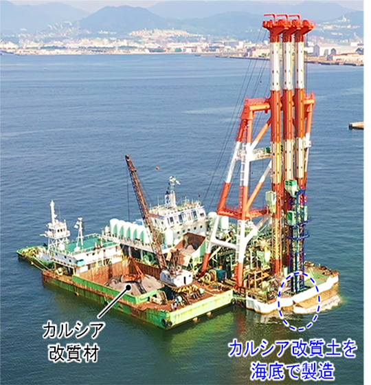 カルシア改質土のバッチ式原位置混合工法は、サンドコンパクションパイル工法の専用船に取り付けた改質装置(=密閉式バケット)を用いて海底の軟弱粘性土を直接掘削し、バケット内でカルシア改質材と混合することで、浚渫を伴わずに原位置で改質土を製造する工法です。
